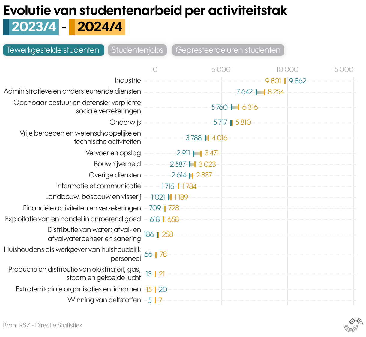 Evolutie van studentenarbeid per activiteitstak 2023/4 - 2024/4