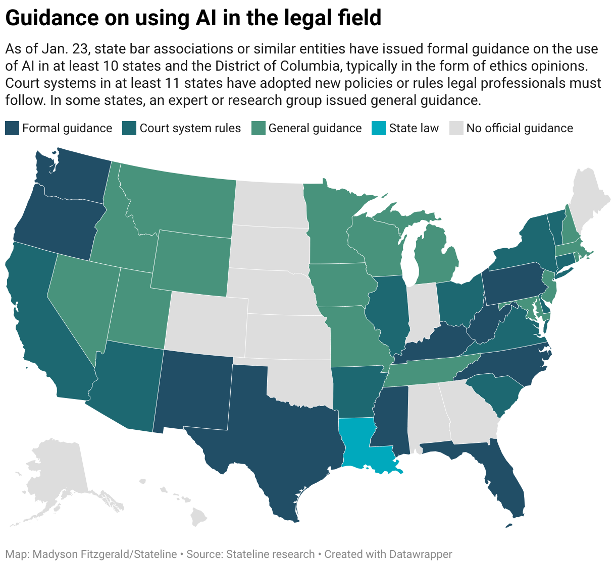 As of Jan. 23, state bar associations or similar entities have issued formal guidance on the use of AI in at least 10 states and the District of Columbia, typically in the form of ethics opinions. Court systems in at least 11 states have adopted new policies or rules legal professionals must follow. In some states, an expert or research group issued general guidance.