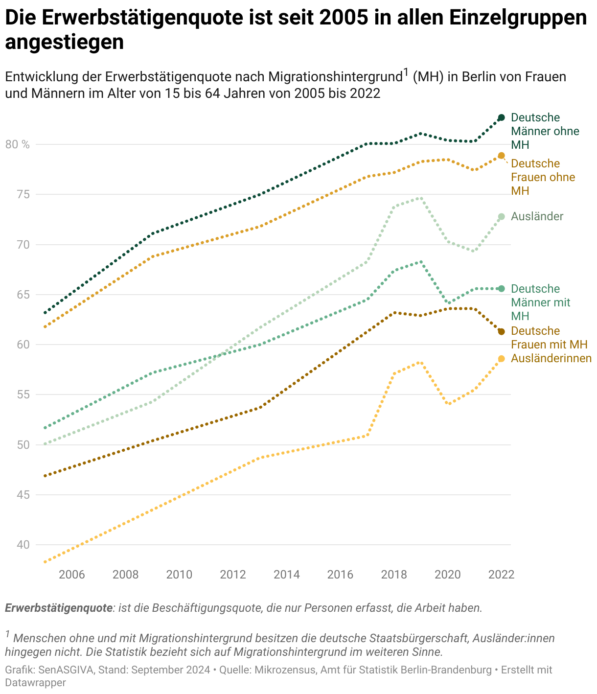 Im Jahr 2022 war die Erwerbsquote mit 82,7 Prozent bei deutschen Männern ohne Migrationshintergrund und 78,9 Prozent bei deutschen Frauen ohne Migrationshintergrund am höchsten. Es folgten Männer ohne deutsche Staatsbürgerschaft mit 72,8 Prozent.
