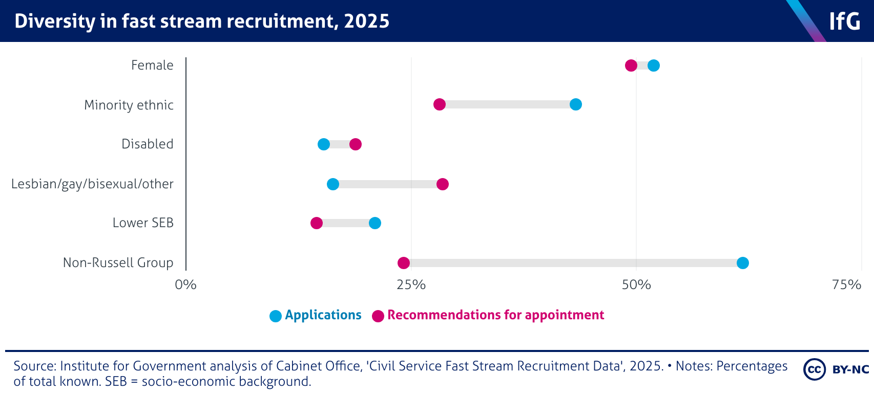 A dot plot from the Institute for Government showing the diversity of applicants and appointees in the civil service fast stream, 2024, where the share of appointees who are disabled and LGB+ is larger than the share of applicants, but the share of female, ethnic minority, non-Russell Group appointees and appointees from lower socio-economic backgrounds is lower than the share of applicants.