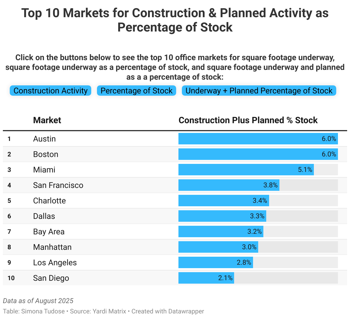 Click on the buttons below to see the top 10 office markets for square footage underway, square footage underway as a percentage of stock, and square footage underway and planned as a a percentage of stock: