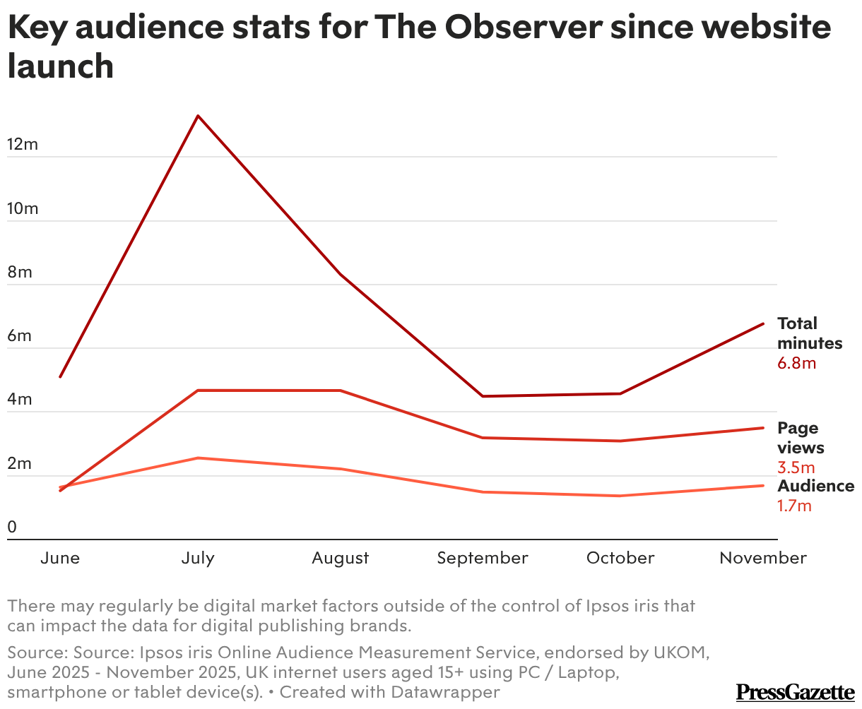 Key audience stats for The Observer since website launch