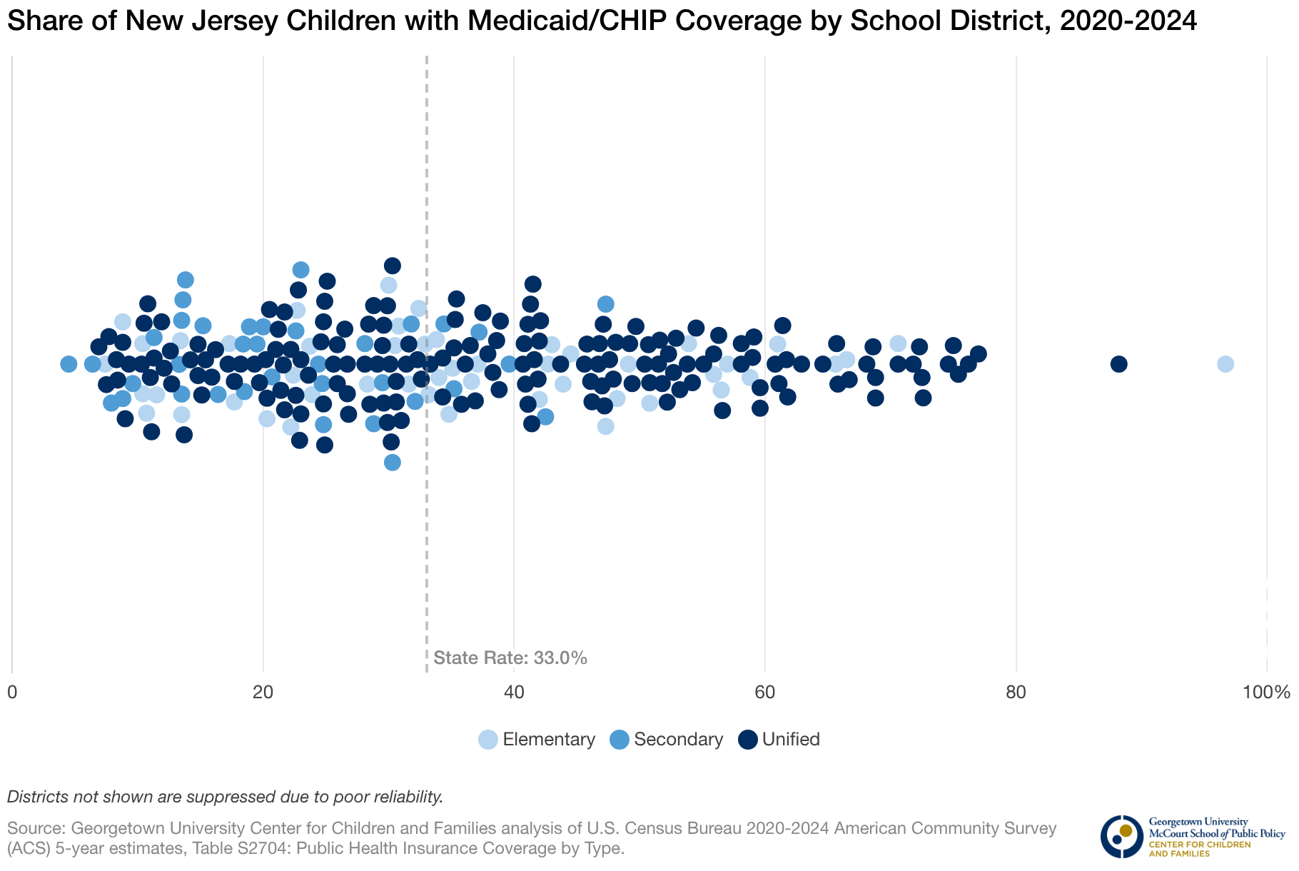 Share of New Jersey Children with Medicaid/CHIP Coverage by School District, 2020-2024