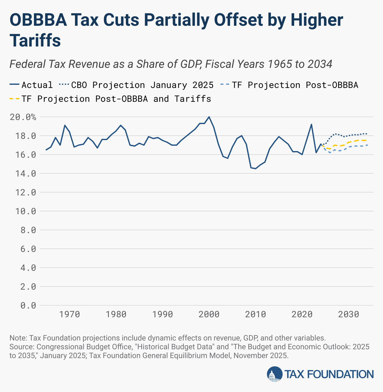 Federal Tax Revenue as a Share of GDP, Fiscal Years 1965 to 2034