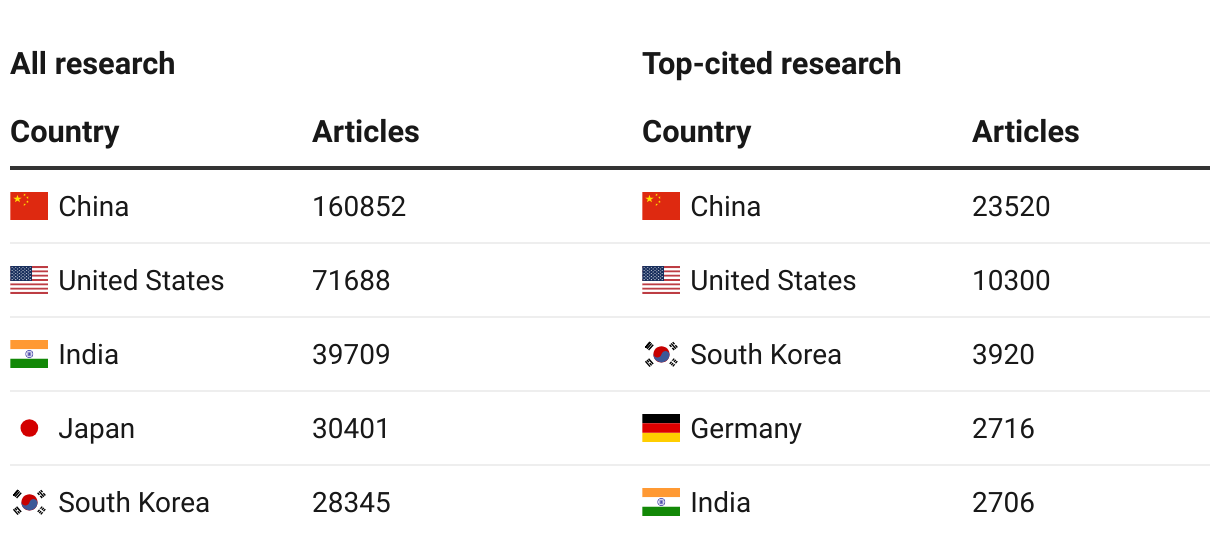 Top producers of chip design and fabrication research articles, 2018-2023