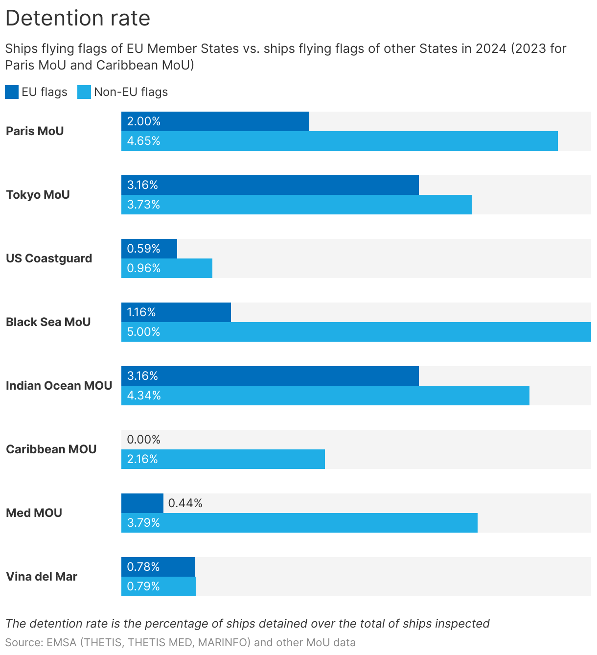 Ships flying flags of EU Member States vs. ships flying flags of other States in 2024 (2023 for Paris MoU and Caribbean MoU)