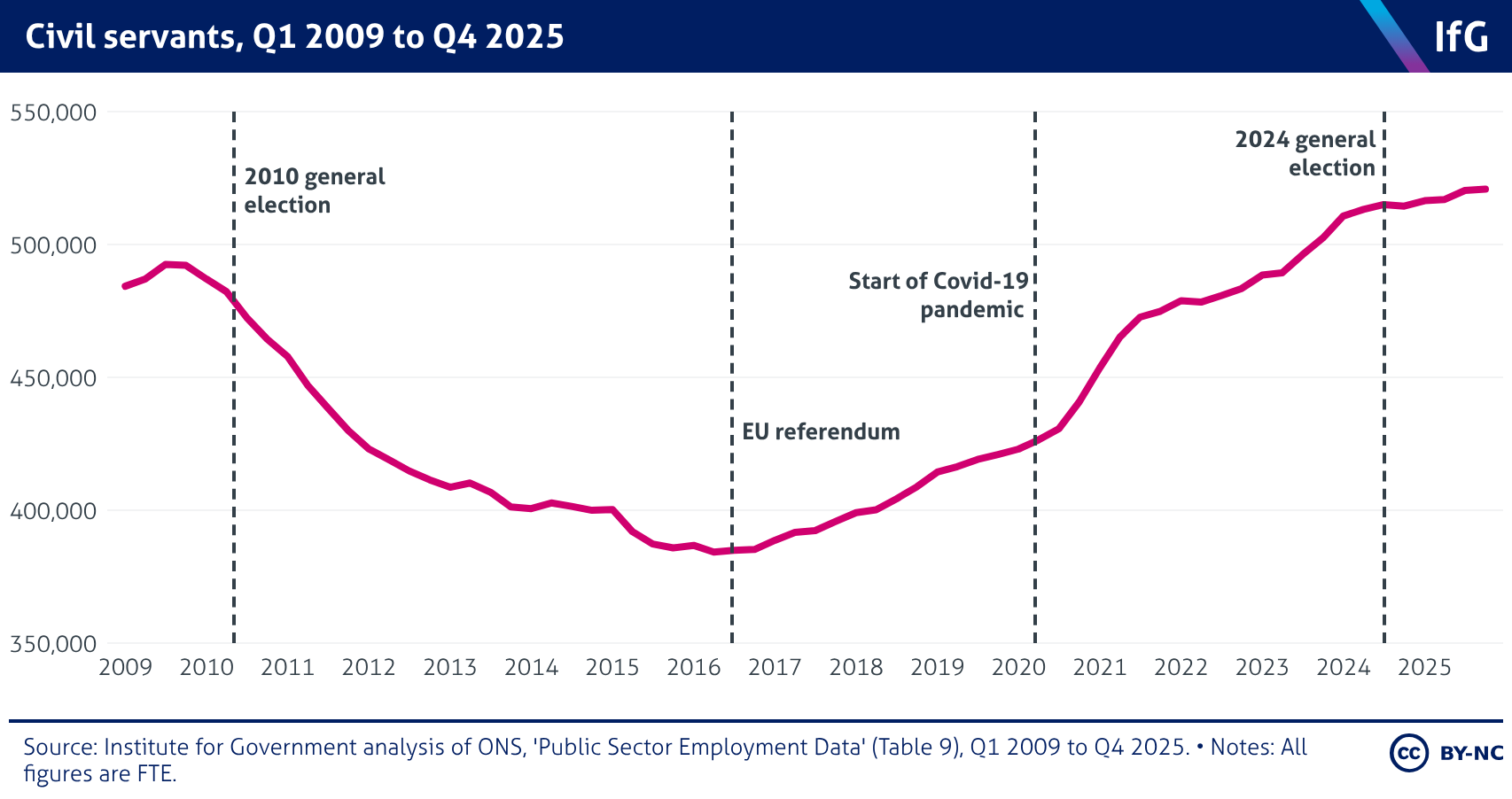 A line chart from the Institute for Government showing total numbers of civil servants (FTE) from Q1 2009 to Q2 2025, where the number of civil servants broadly decreased from 2009 until the EU referendum in 2016, and then broadly increased until the present quarter. Numbers increased particularly rapidly during the Covid-19 pandemic.
