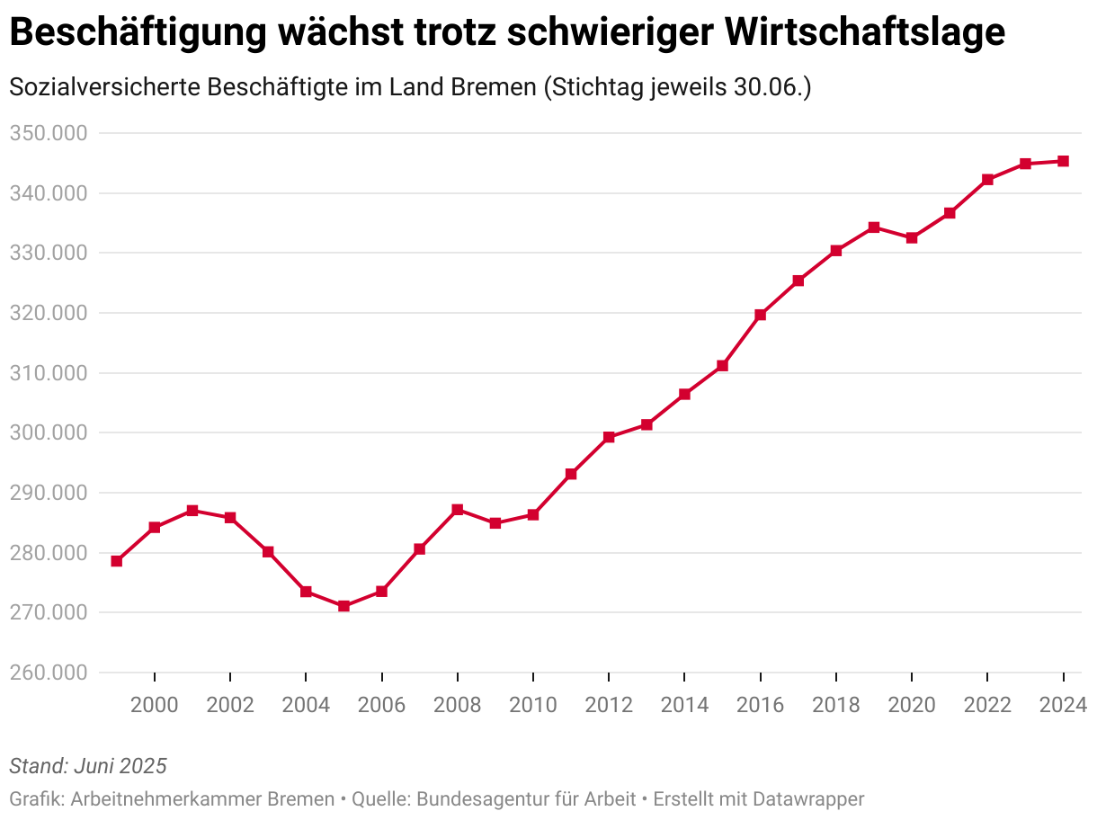 Sozialversicherte Beschäftigte im Land Bremen (Stichtag jeweils 30.06.)