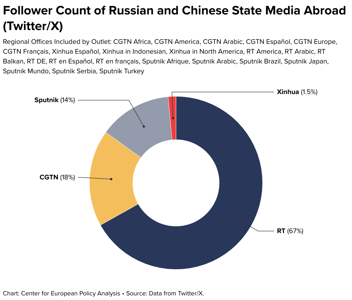 Regional Offices Included by Outlet: CGTN Africa, CGTN America, CGTN Arabic, CGTN Español, CGTN Europe, CGTN Français, Xinhua Español, Xinhua in Indonesian, Xinhua in North America, RT America, RT Arabic, RT Balkan, RT DE, RT en Español, RT en français, Sputnik Afrique, Sputnik Arabic, Sputnik Brazil, Sputnik Japan, Sputnik Mundo, Sputnik Serbia, Sputnik Turkey