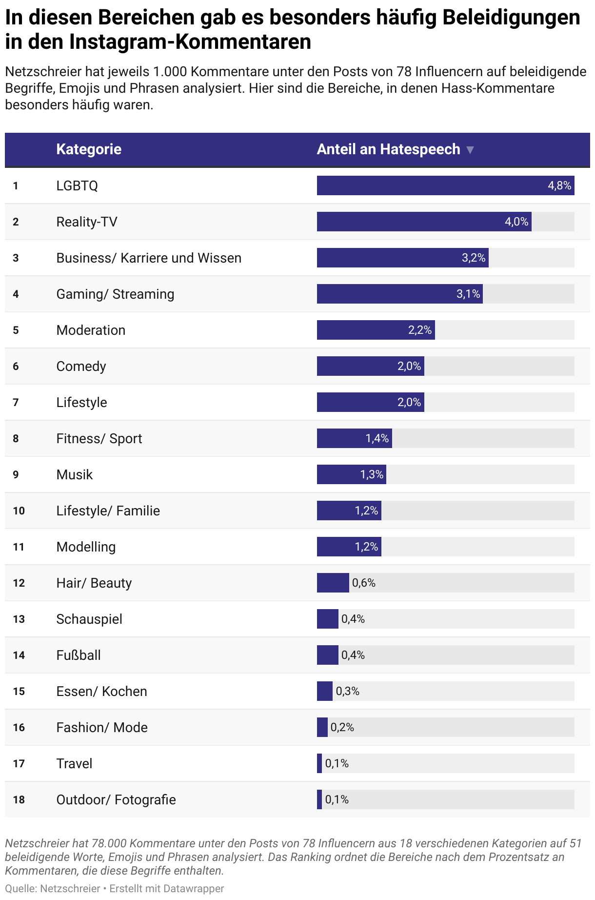 Netzschreier hat jeweils 1.000 Kommentare unter den Posts von 78 Influencern auf beleidigende Begriffe, Emojis und Phrasen analysiert. Hier sind die Bereiche, in denen Hass-Kommentare besonders häufig waren.