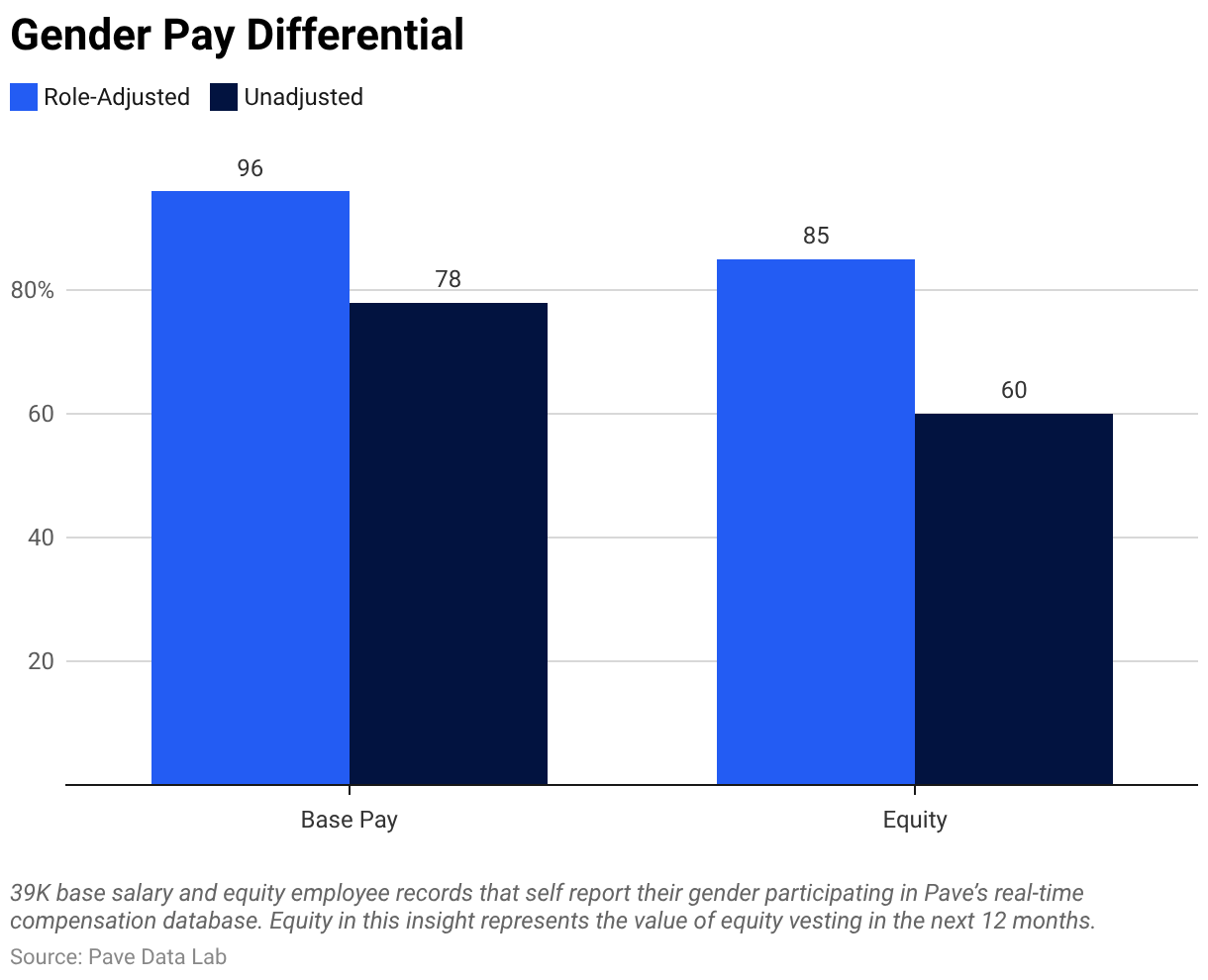Our findings show the unadjusted gender pay gap for base salaries is currently 22%. Or, to put things another way, women make 78% of what men do. This result is consistent with data reported by the U.S. government over many decades. However, this unadjusted number does not control for any other variables, such as job family, job level, or location.