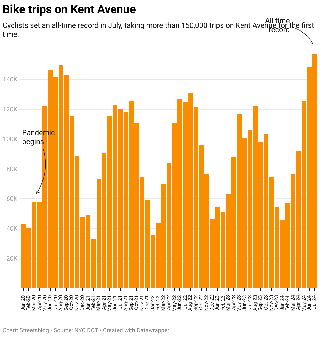Cyclists set an all-time record in July, taking more than 150,000 trips on Kent Avenue for the first time.