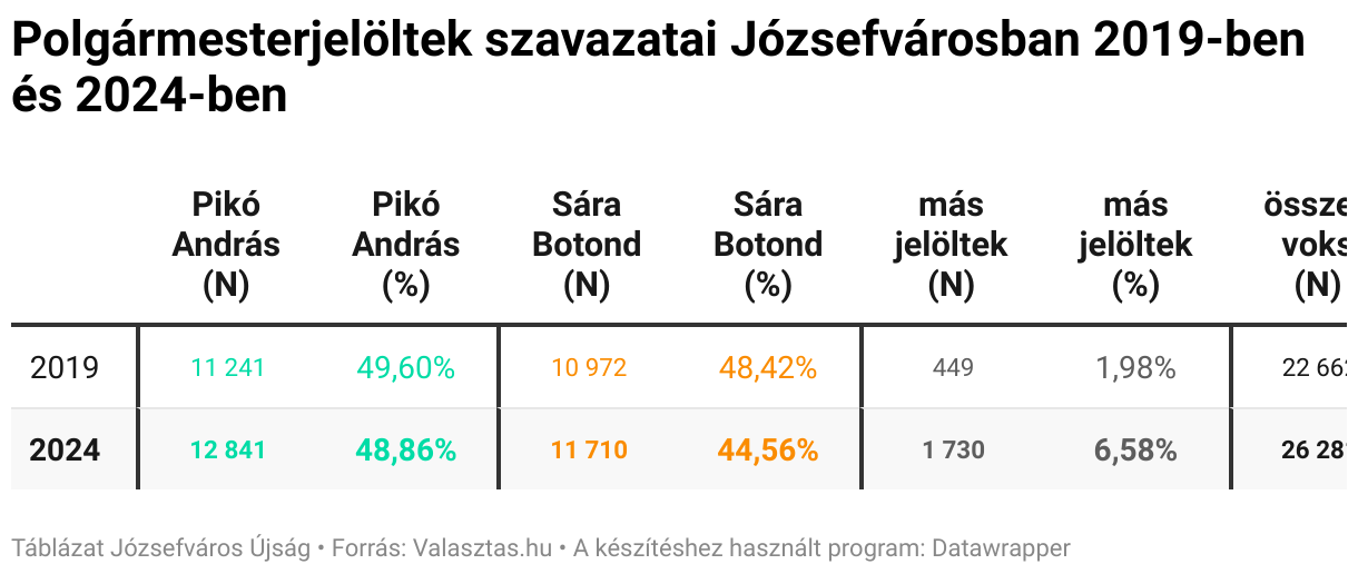 Polgármesterjelöltek szavazatai Józsefvárosban 2019-ben és 2024-ben