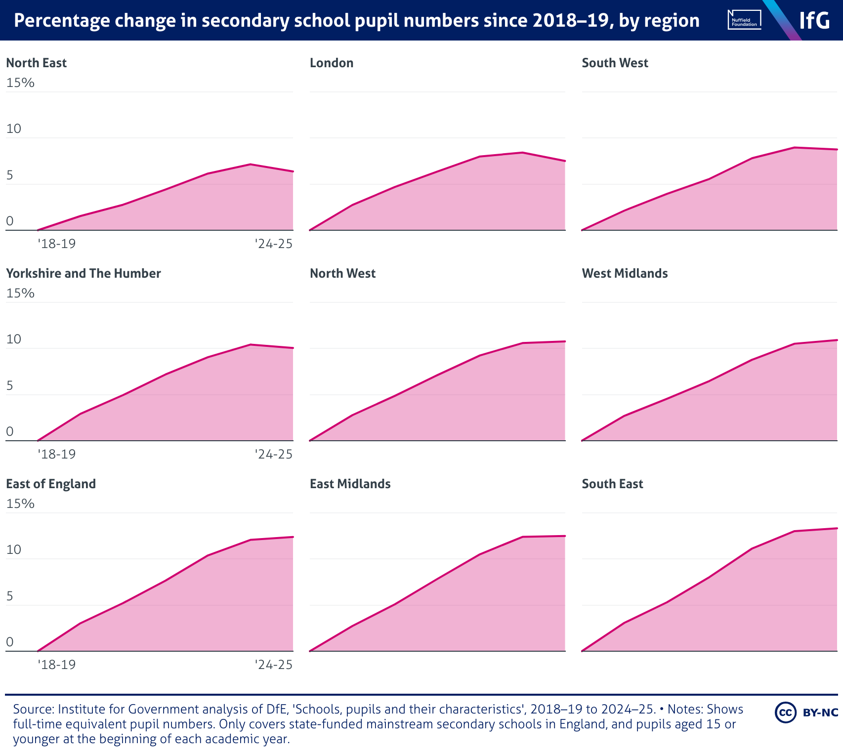 A small multiple area chart from the Institute for Government of the percentage change in secondary school pupil numbers since 2018–19, by region, where all regions of England have seen sustained growth, but the North East, London, South West and Yorkshire and the Humber saw a decline between 2023–24 and 2024–25.