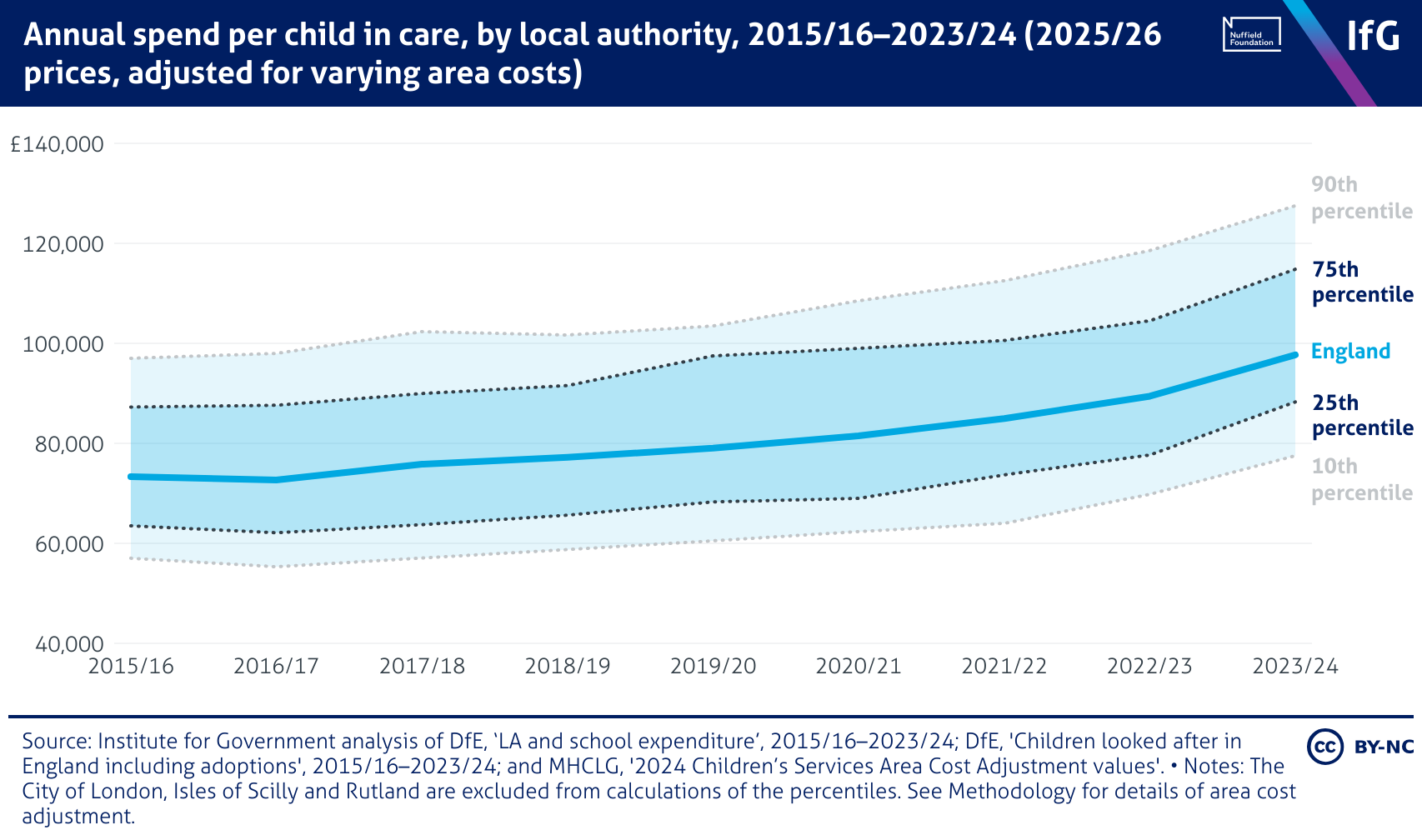 A line chart from the Institute for Government showing annual spend per child in care, by local authority, 2015/16–2023/24 (2025/26 prices, adjusted for varying area costs), where average spending in England has risen from £73,339 to £97,689, with variation at a local authority level growing over time. In 2023/24, the 90th percentile exceeded £120,000 and the 10th percentile was below £80,000.