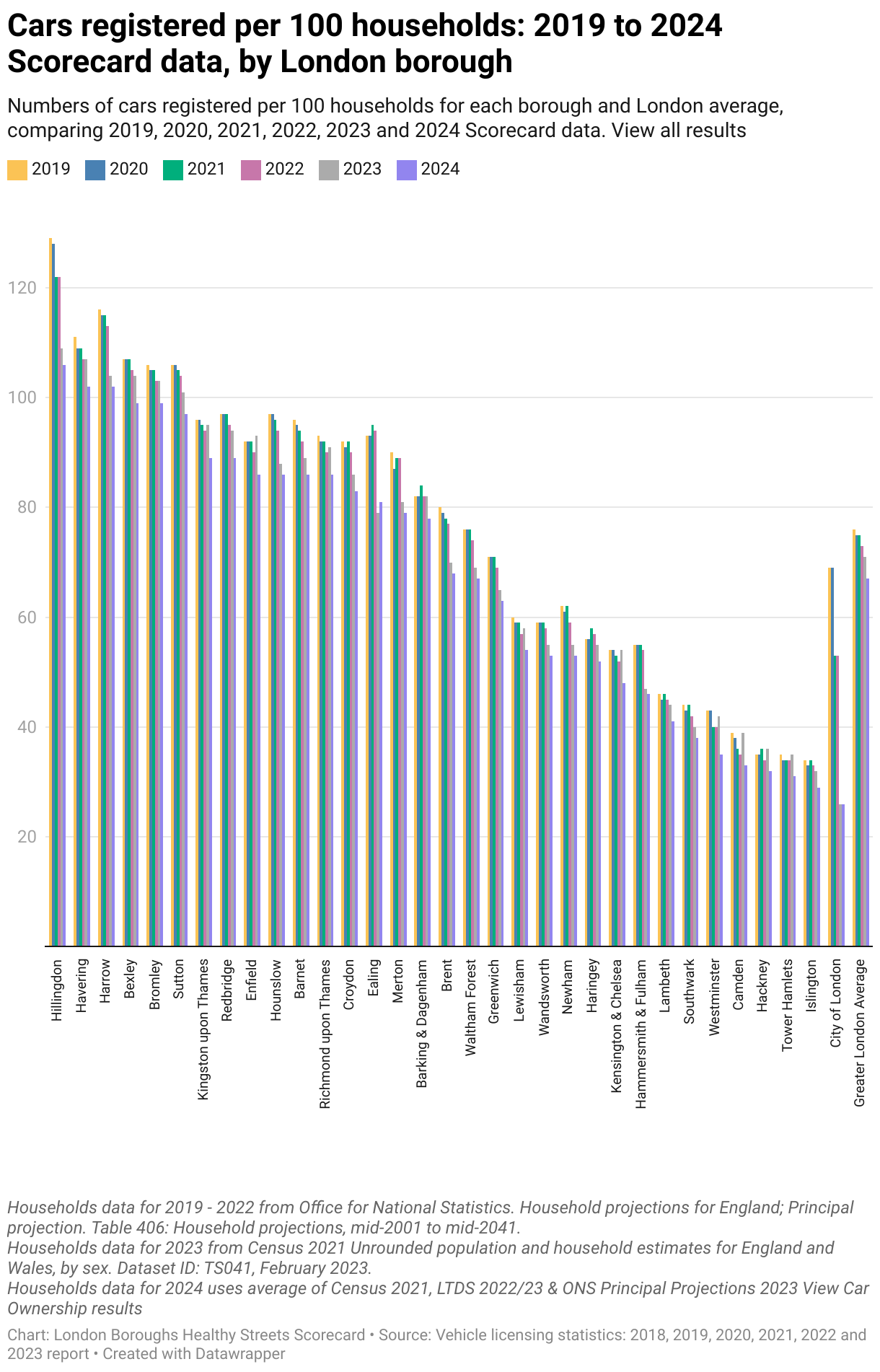 Numbers of cars registered per 100 households for each borough and London average, comparing 2019, 2020, 2021, 2022, 2023 and 2024 Scorecard data. View all results