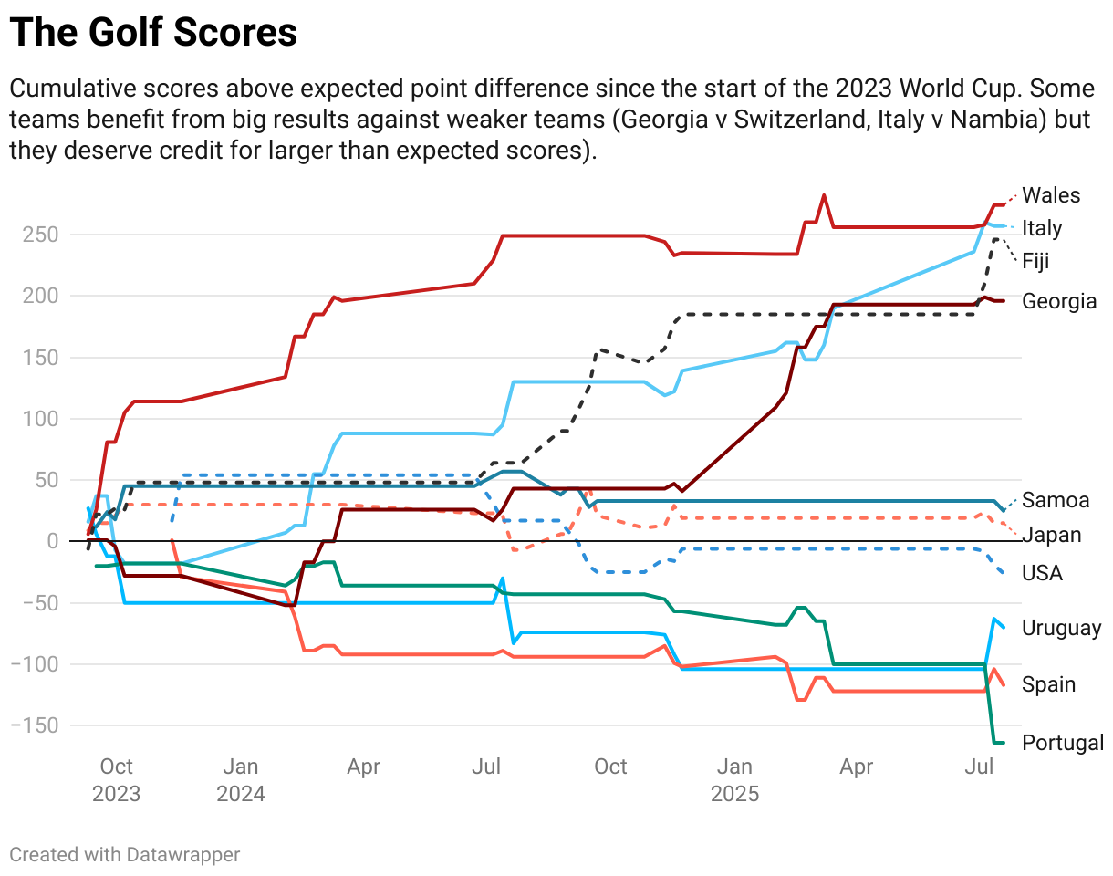 Cumulative scores above expected point difference since the start of the 2023 World Cup. Some teams benefit from big results against weaker teams (Georgia v Switzerland, Italy v Nambia) but they deserve credit for larger than expected scores).