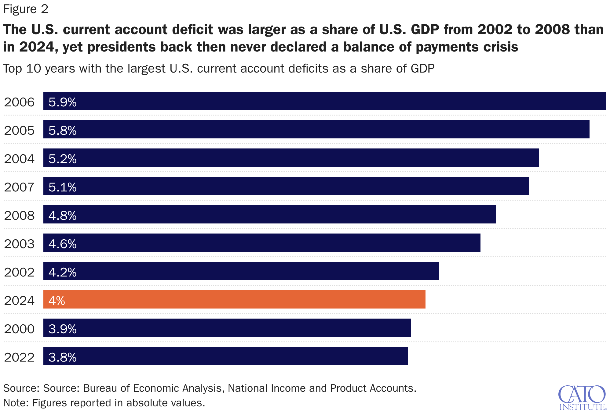 Top 10 years with the largest U.S. current account deficits as a share of GDP