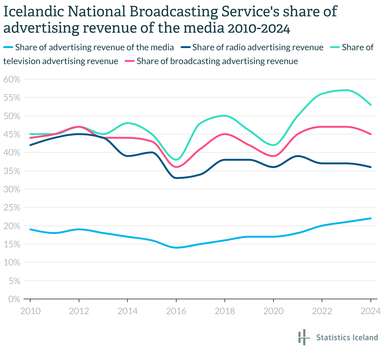 Icelandic National Broadcasting Service's share of advertising revenue of the media 2010-2024