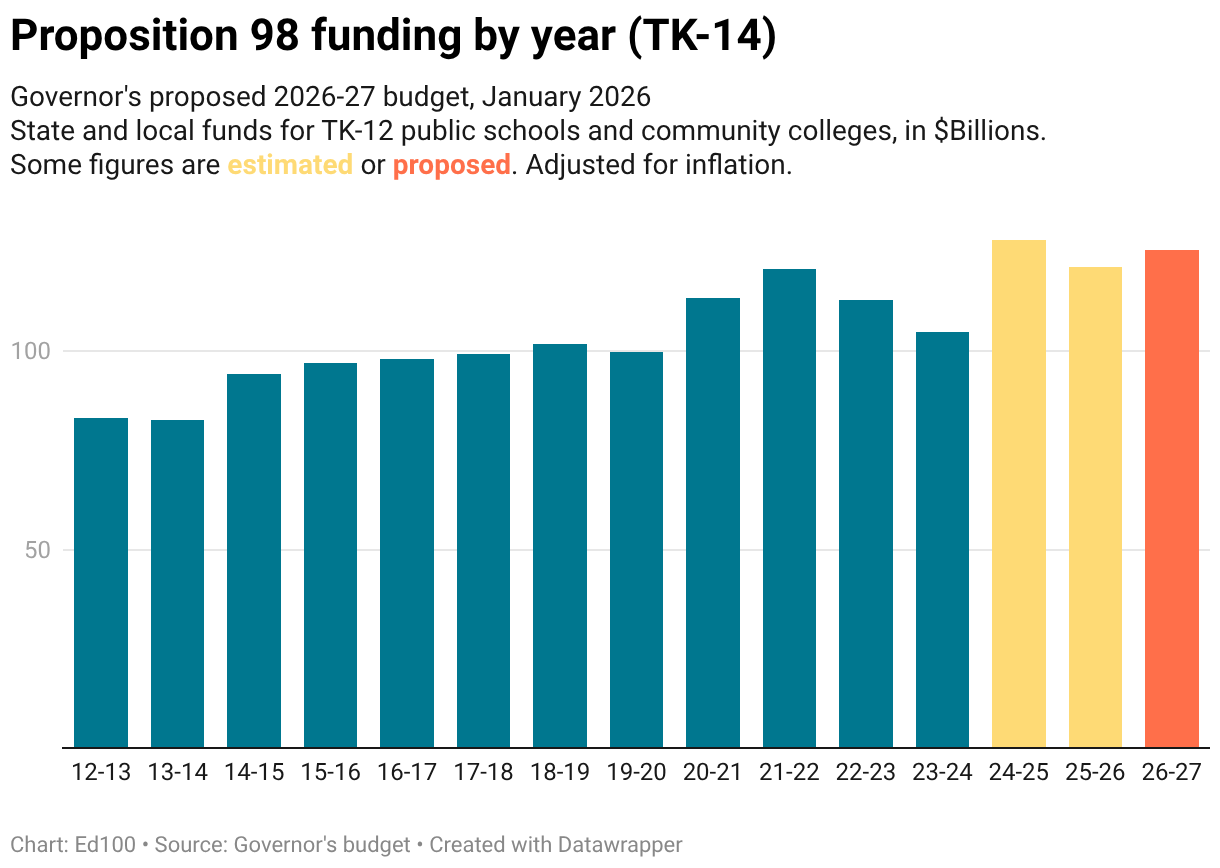 Governor's proposed 2026-27 budget, January 2026 State and local funds for TK-12 public schools and community colleges, in $Billions. Some figures are estimated or proposed. Adjusted for inflation.