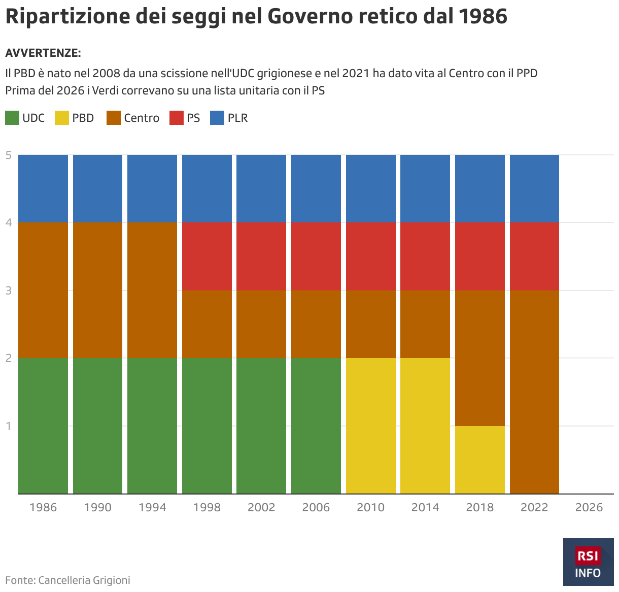 AVVERTENZE: Il PBD è nato nel 2008 da una scissione nell'UDC grigionese e nel 2021 ha dato vita al Centro con il PPD Prima del 2026 i Verdi correvano su una lista unitaria con il PS