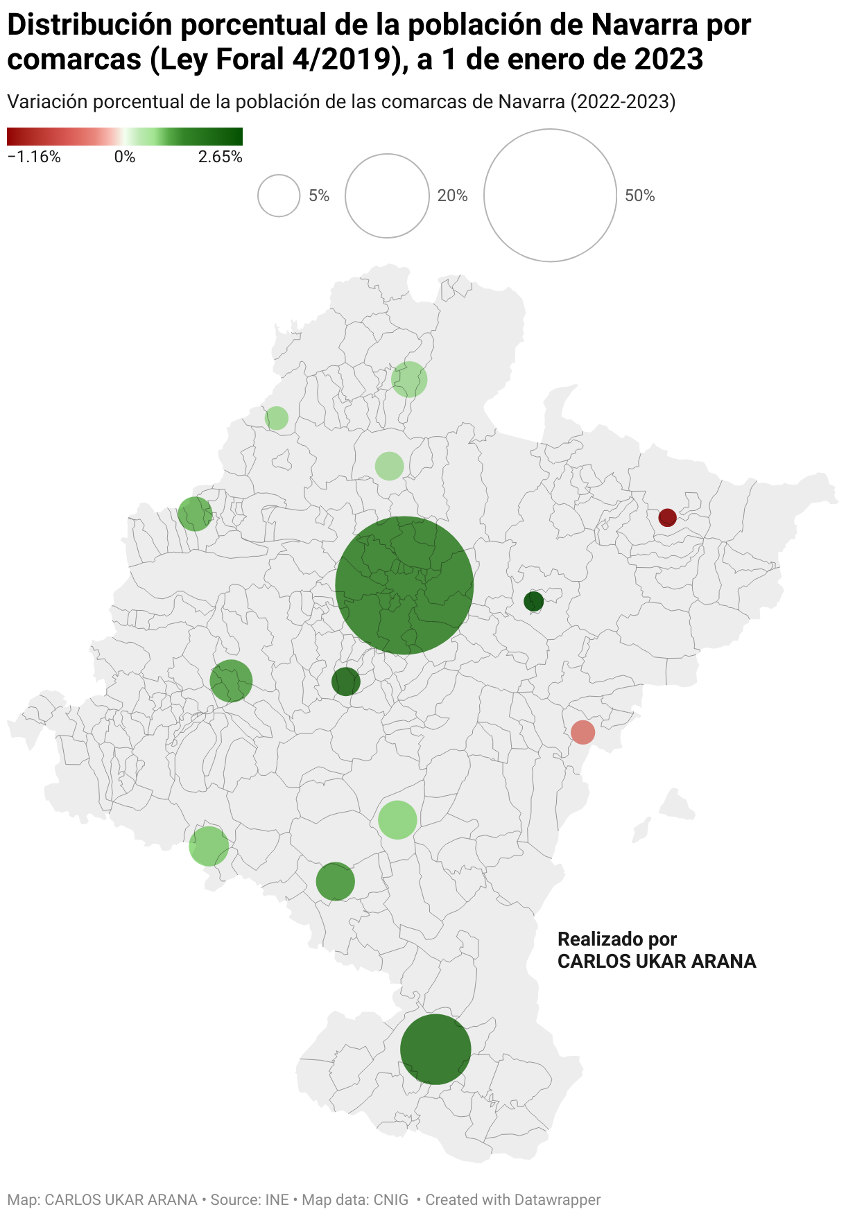 Variación porcentual de la población de las comarcas de Navarra (2022-2023)