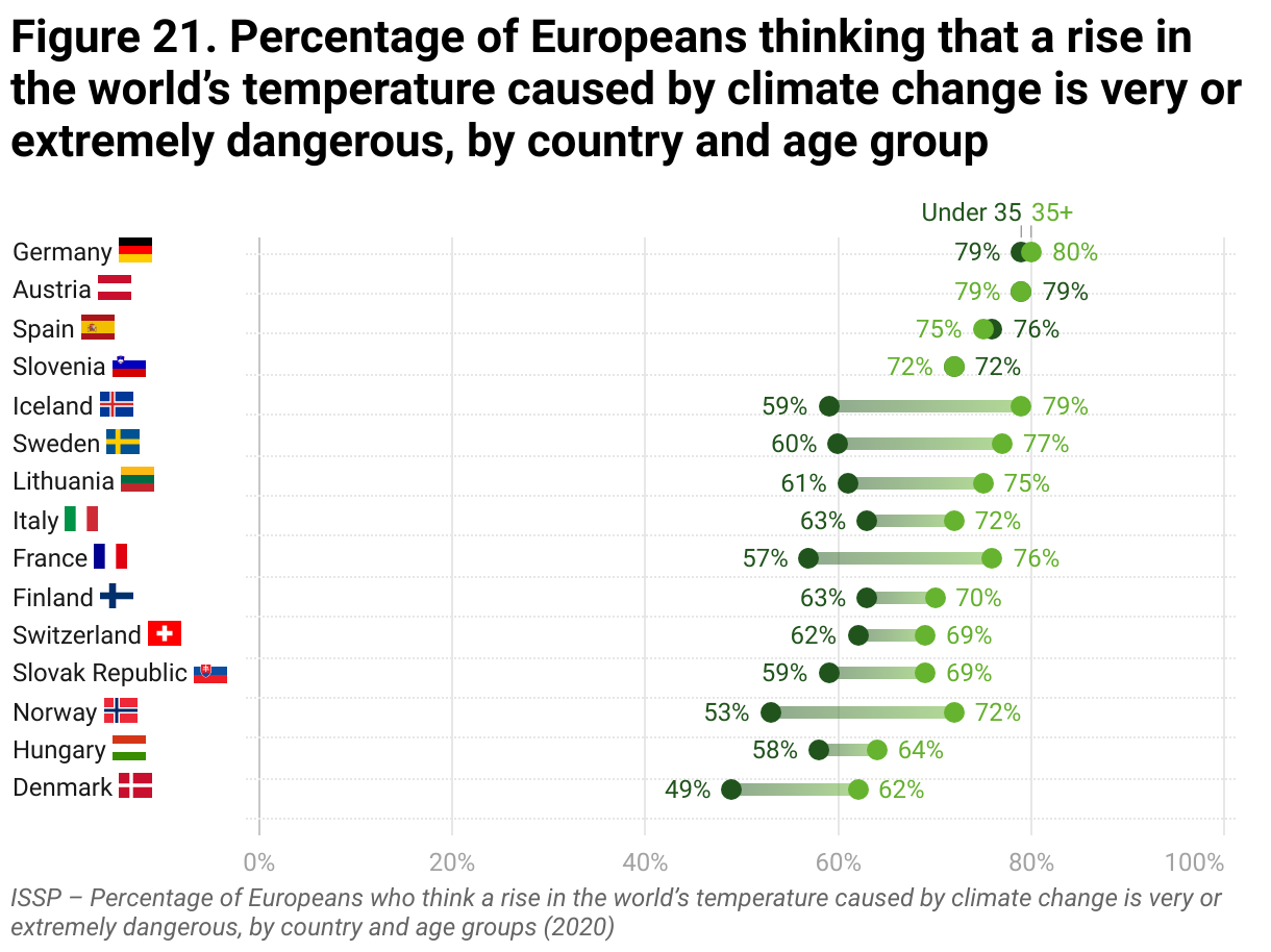 Figure 21. Percentage of Europeans thinking that a rise in the world’s temperature caused by climate change is very or extremely dangerous, by country and age group