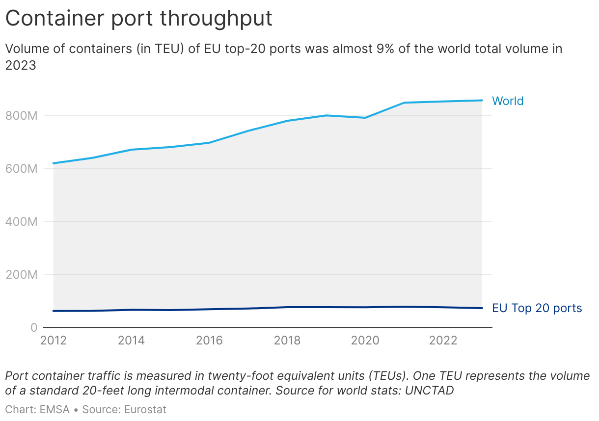 Volume of containers (in TEU) of EU top-20 ports was almost 9% of the world total volume in 2023