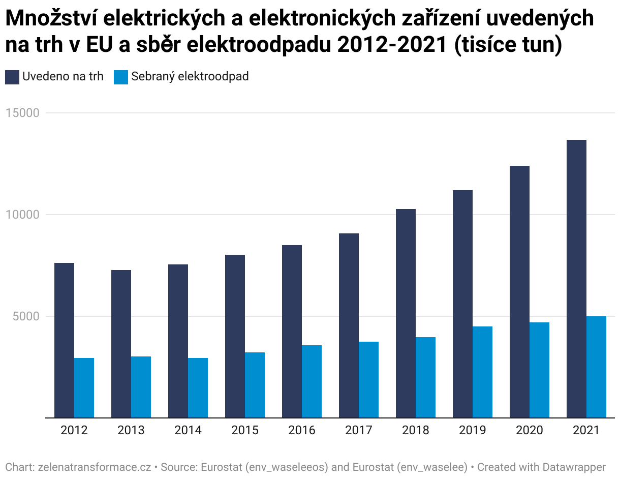 Množství elektrických a elektronických zařízení uvedených na trh v EU a sběr elektroodpadu 2012-2021 (tisíce tun)