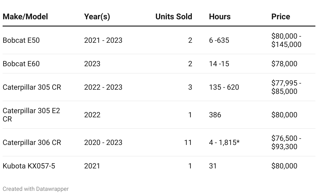 Top 20 Mini Excavators Sold at Auction 6/1/23 - 5/31/24