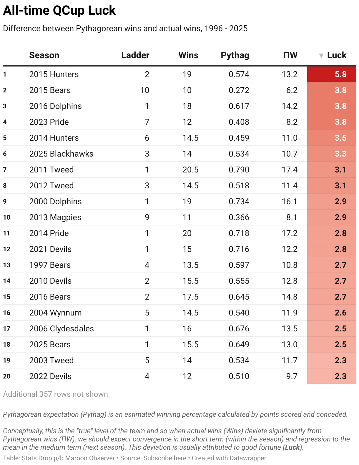 Difference between Pythagorean wins and actual wins, 1996 - 2025