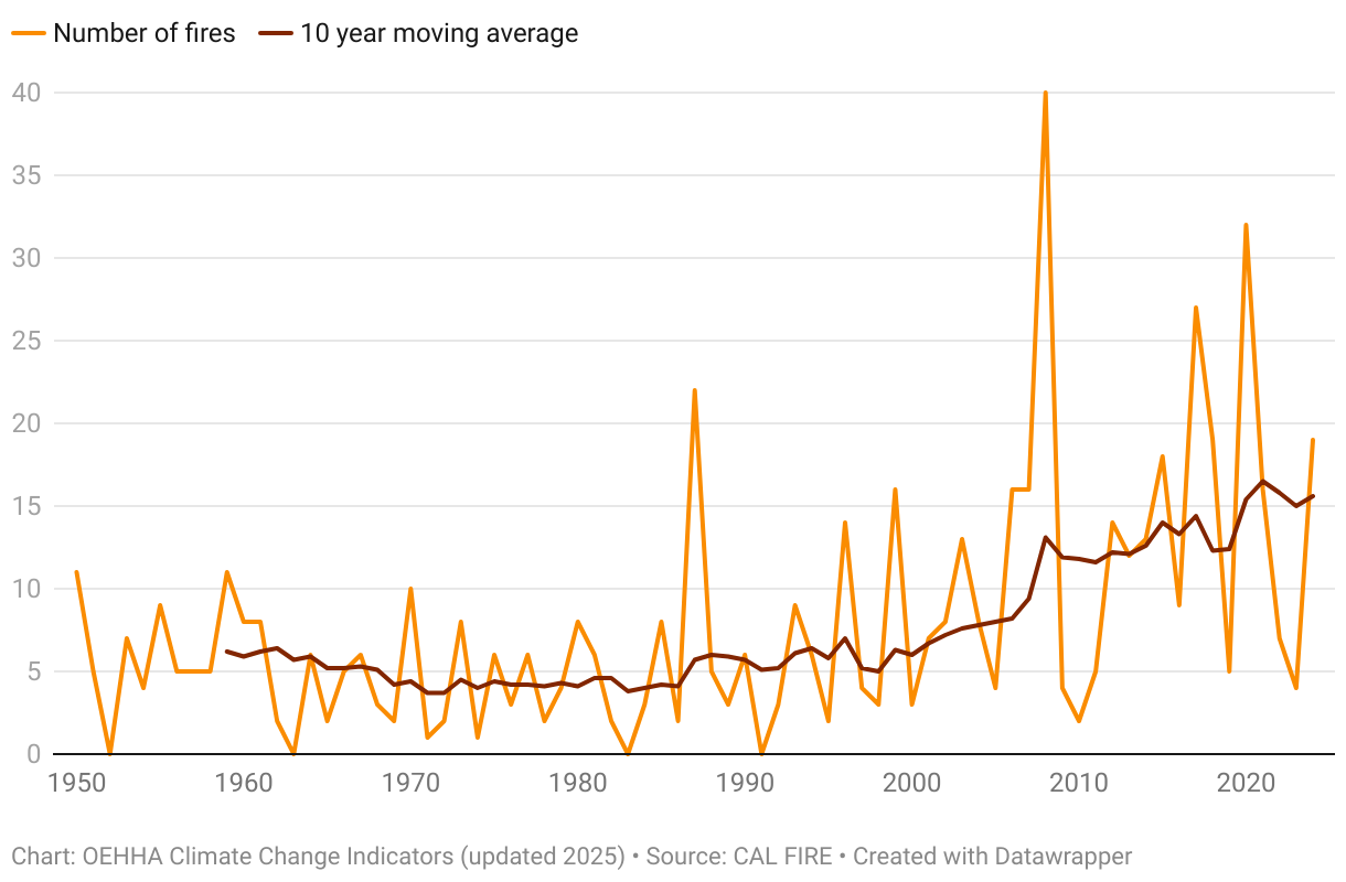 This line graph shows the annual number of large wildfires in California has increased in recent decades.