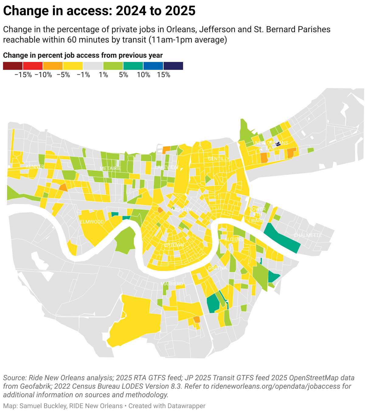 Change in the percentage of private jobs in Orleans, Jefferson and St. Bernard Parishes reachable within 60 minutes by transit (11am-1pm average)