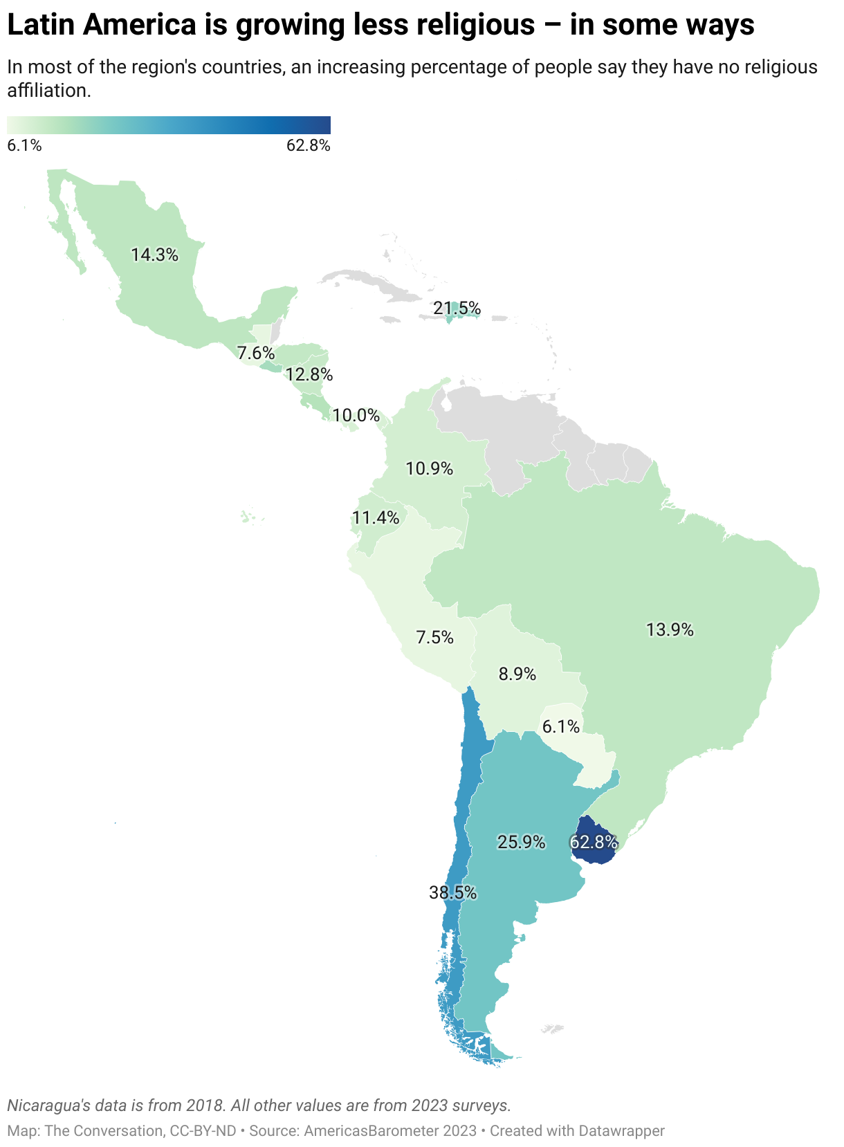 A map of Central and South America shows countries shaded along a blue-green spectrum to show what percentage of people in each country do not belong to a particular religion.