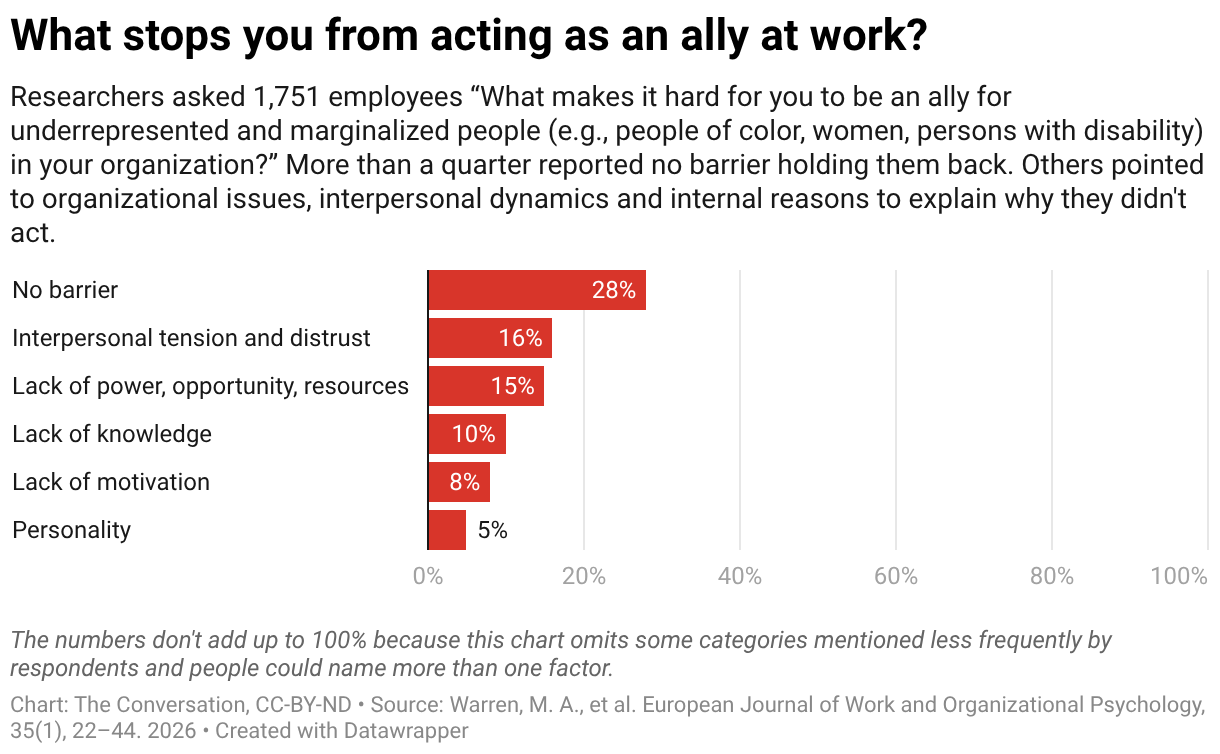 Researchers asked 1,751 employees “What makes it hard for you to be an ally for underrepresented and marginalized people (e.g., people of color, women, persons with disability) in your organization?” More than a quarter reported no barrier holding them back. Others pointed to organizational issues, interpersonal dynamics and internal reasons to explain why they didn't act.