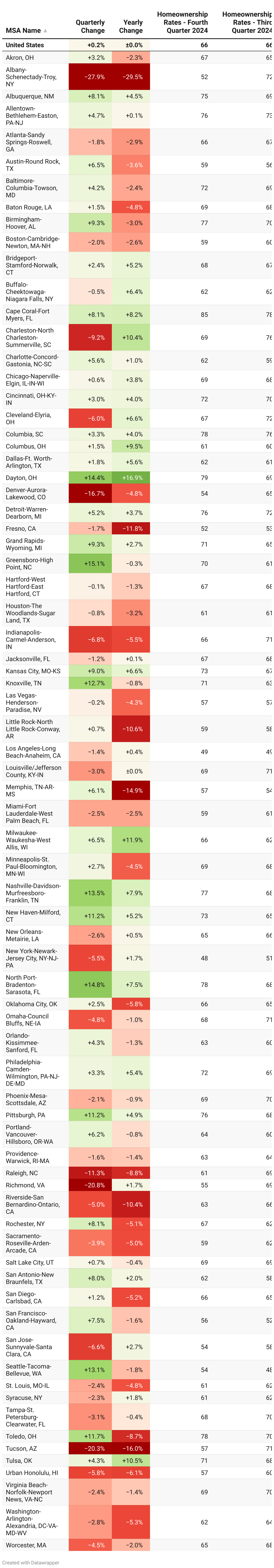 Homeownership rate for the 75 largest US metros, including quarterly and yearly change.