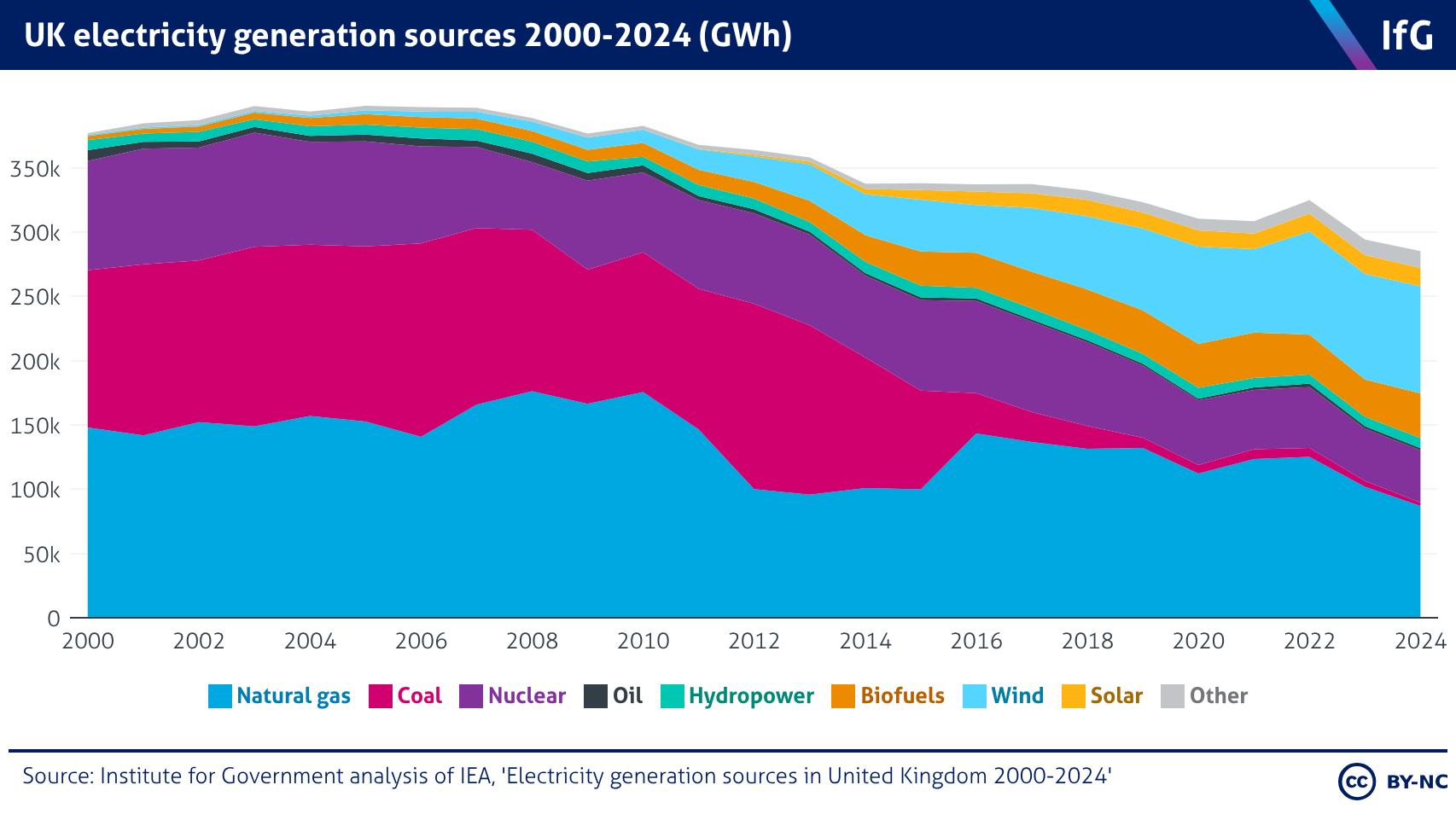 An area chart from the Institute for Government of UK electricity generation sources 2000-2024 where the proportion of coal declines and renewables increase.