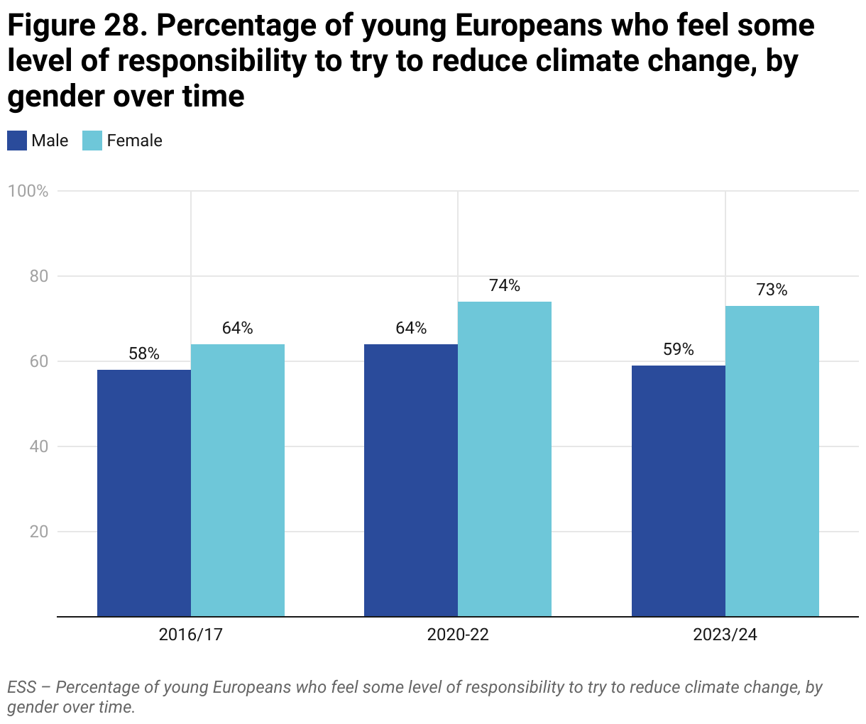 Figure 28. ESS – Percentage of young Europeans who feel some level of responsibility to try to reduce climate change by gender over time.
