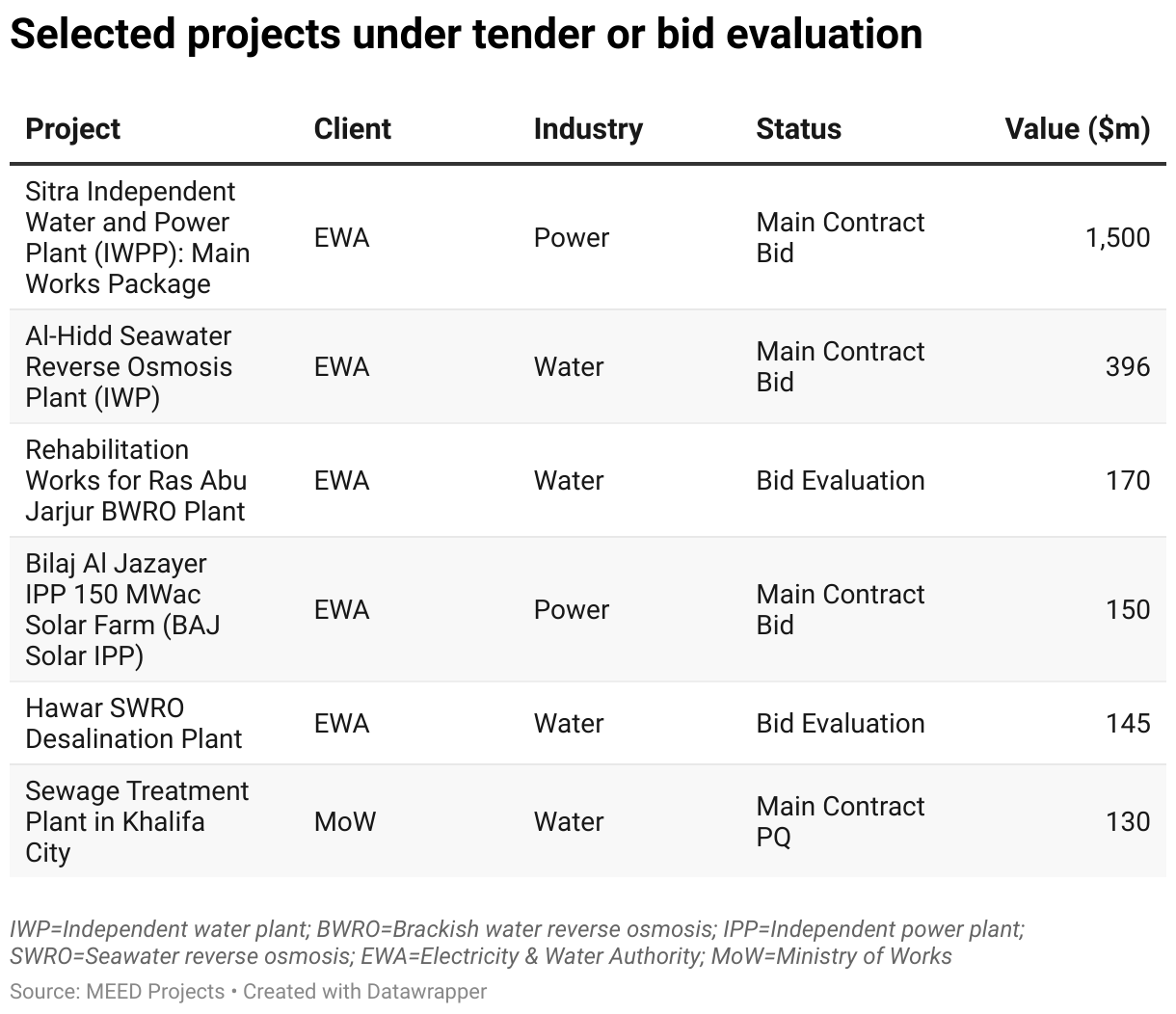 Selected projects under tender or bid evaluation