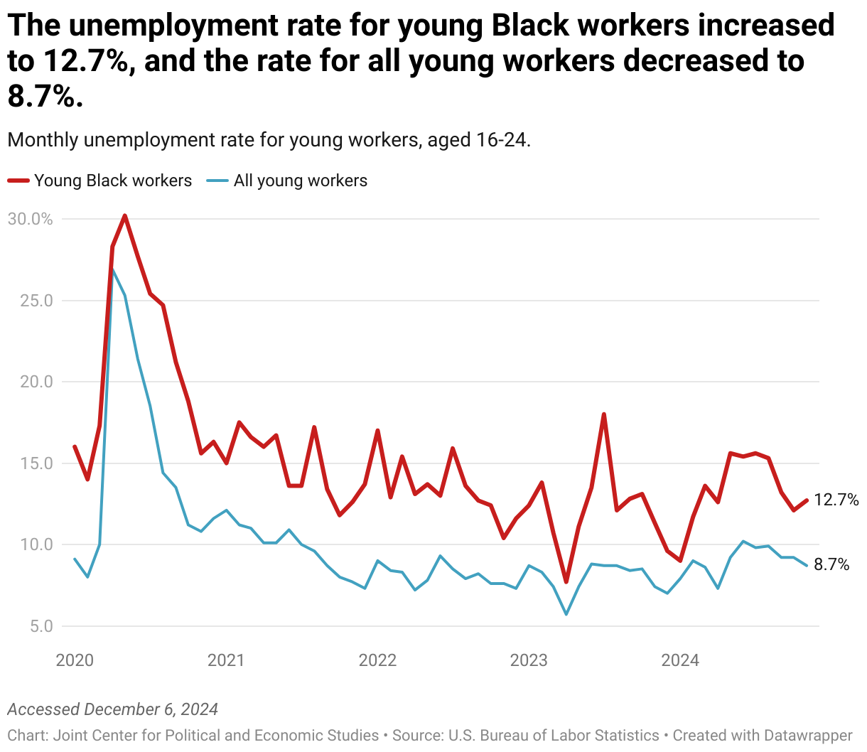 Monthly unemployment rate for young workers, aged 16-24.