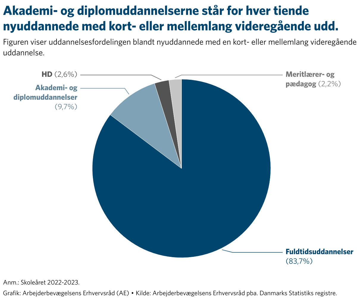 Figuren viser uddannelsesfordelingen blandt nyuddannede med en kort- eller mellemlang videregående uddannelse.