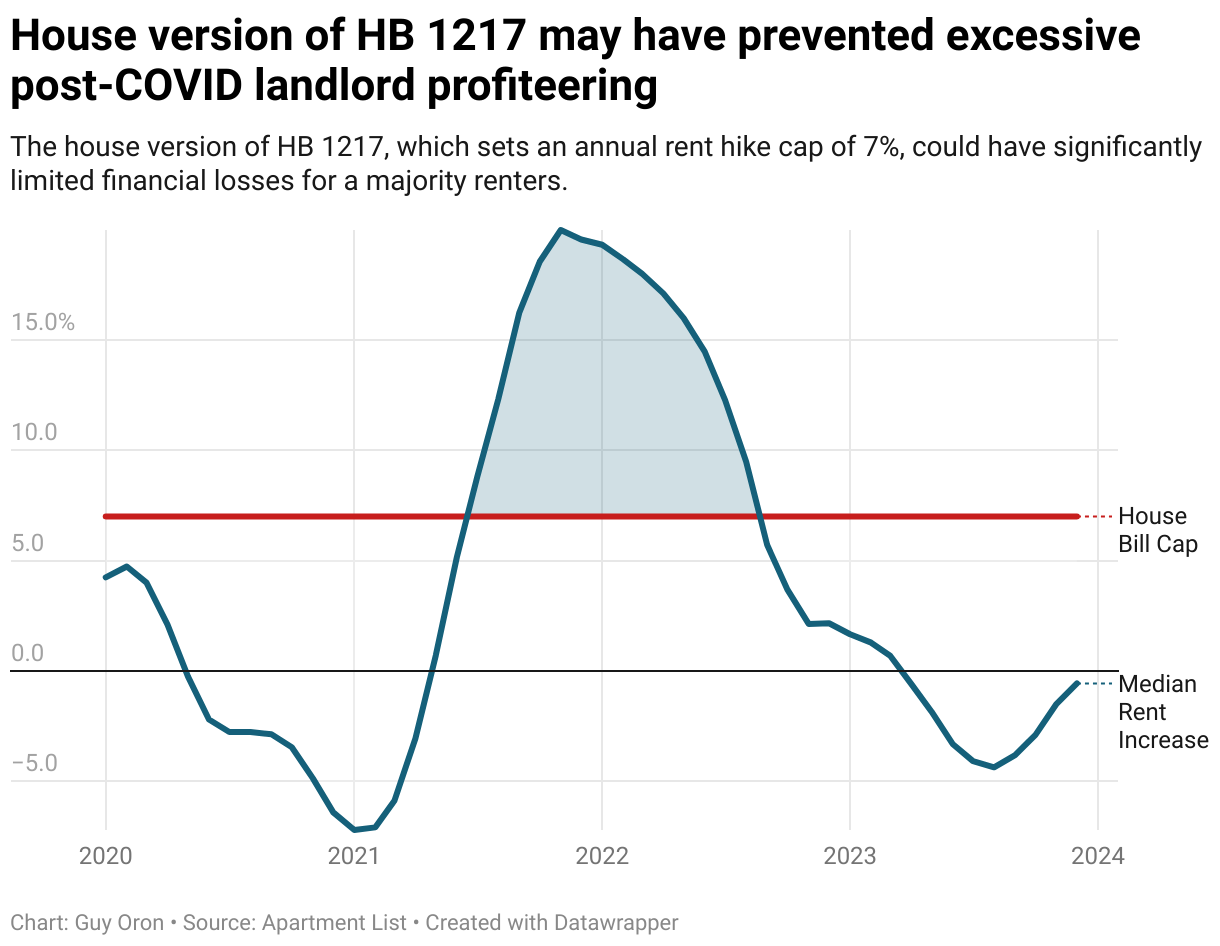 The house version of HB 1217, which sets an annual rent hike cap of 7%, could have significantly limited financial losses for a majority renters.