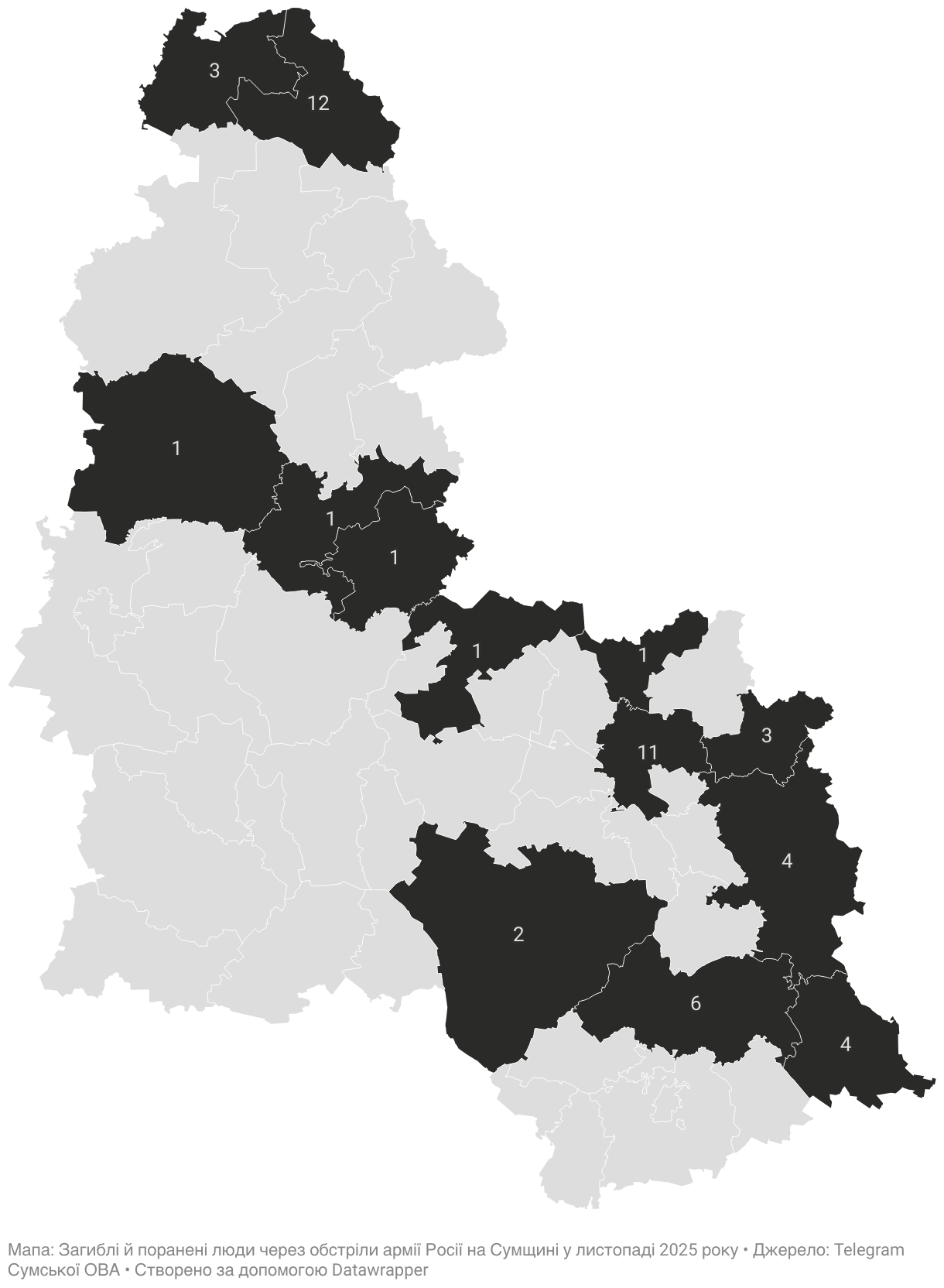 Діаграма: Загиблі й поранені люди через обстріли армії Росії на Сумщині у листопаді 2025 рокуДжерело: Telegram Сумської ОВАЗавантажити зображенняСтворено за допомогою Datawrapper