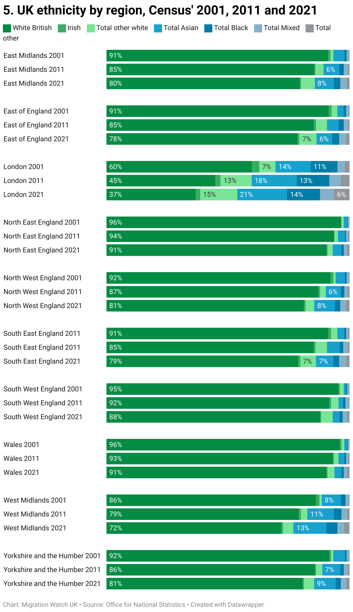 5. UK ethnicity by region, Census' 2001, 2011 and 2021