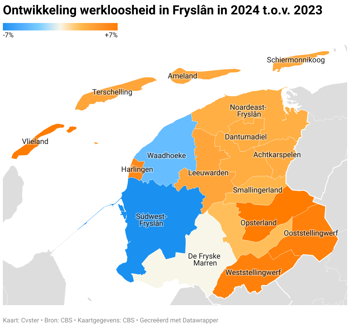 Ontwikkeling werkloosheid in Fryslân in 2024 t.o.v. 2023