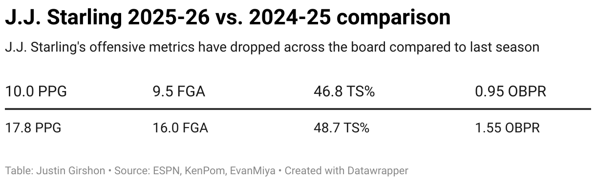 J.J. Starling's offensive metrics have dropped across the board compared to last season