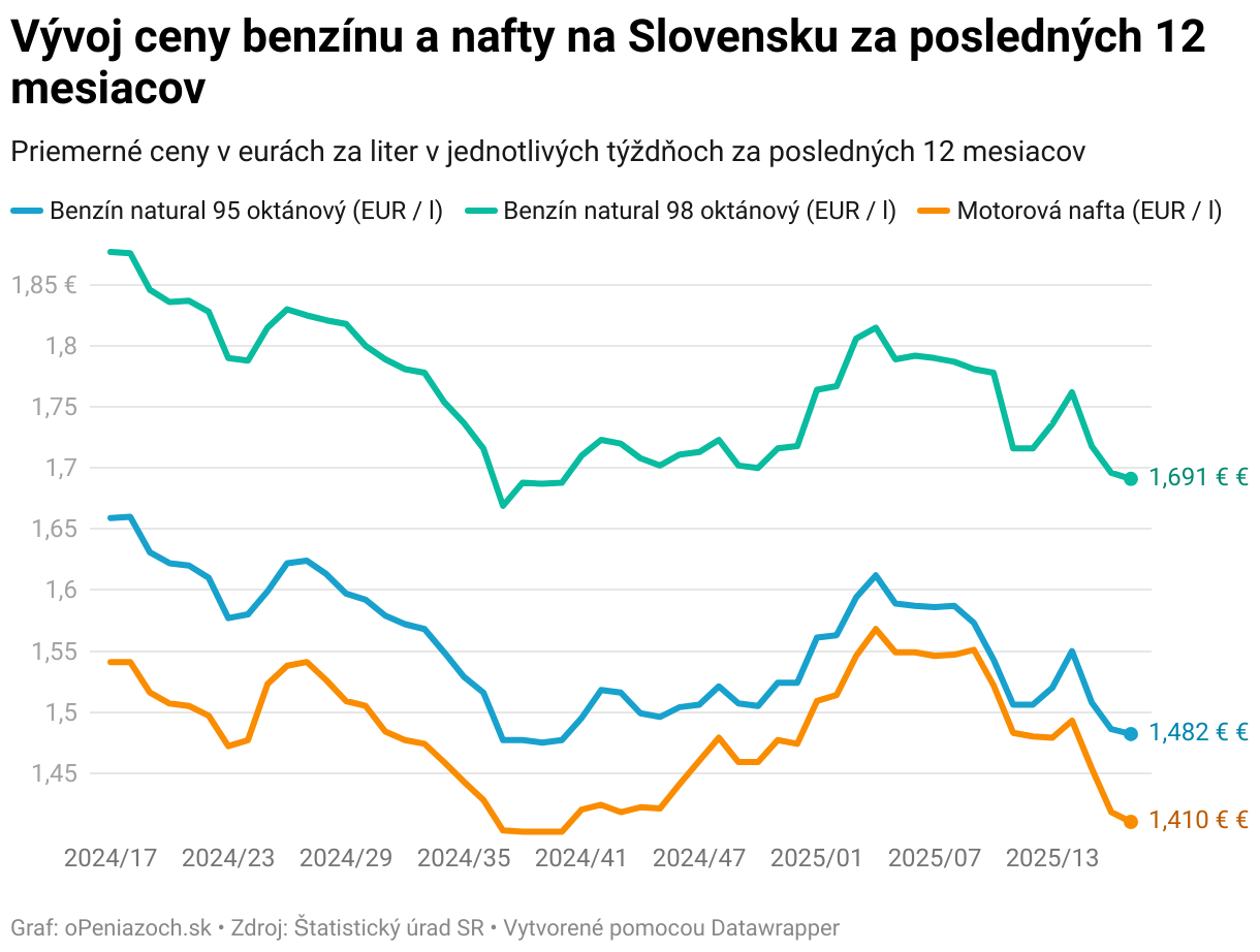 Priemerné ceny v eurách za liter v jednotlivých týždňoch za posledných 12 mesiacov