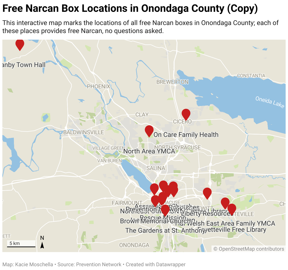 This interactive map marks the locations of all free Narcan boxes in Onondaga County; each of these places provides free Narcan, no questions asked.