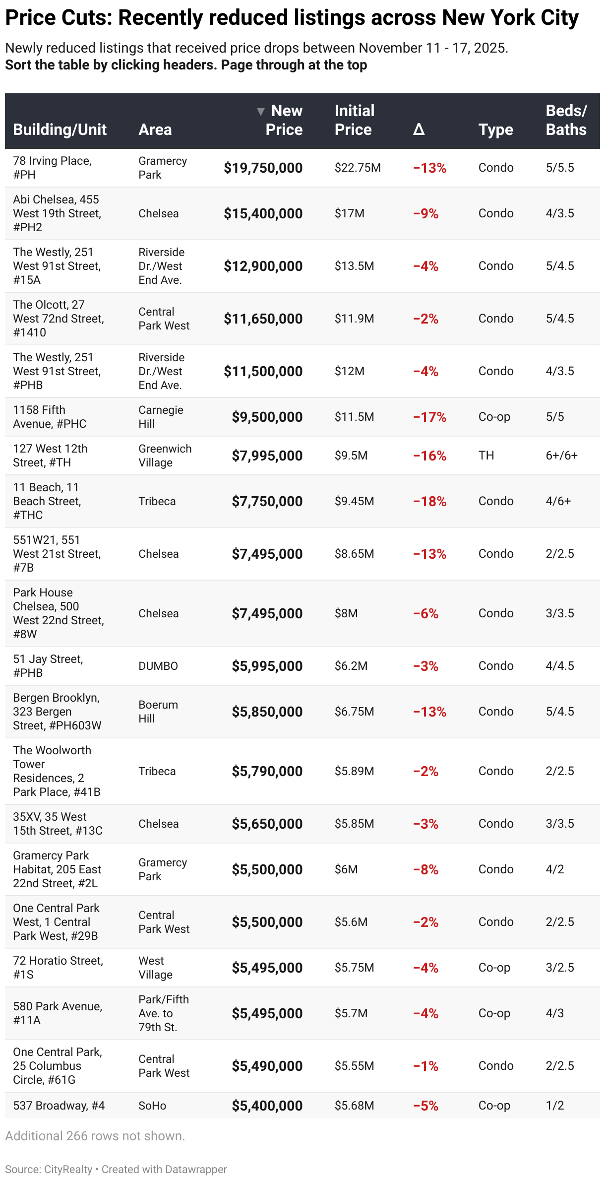 Newly reduced listings that received price drops between November 11 - 17, 2025. Sort the table by clicking headers. Page through at the top