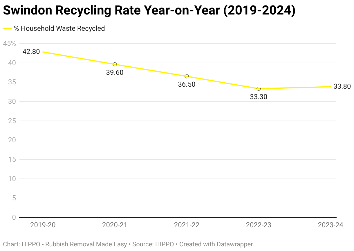A chart displaying Swindon's household recycling rate year-on-year. 2019-20: 42.8%. 2020-21: 39.6%. 2021-22: 36.5%. 2022-23: 33.3%. 2023-24: 33.8%.
